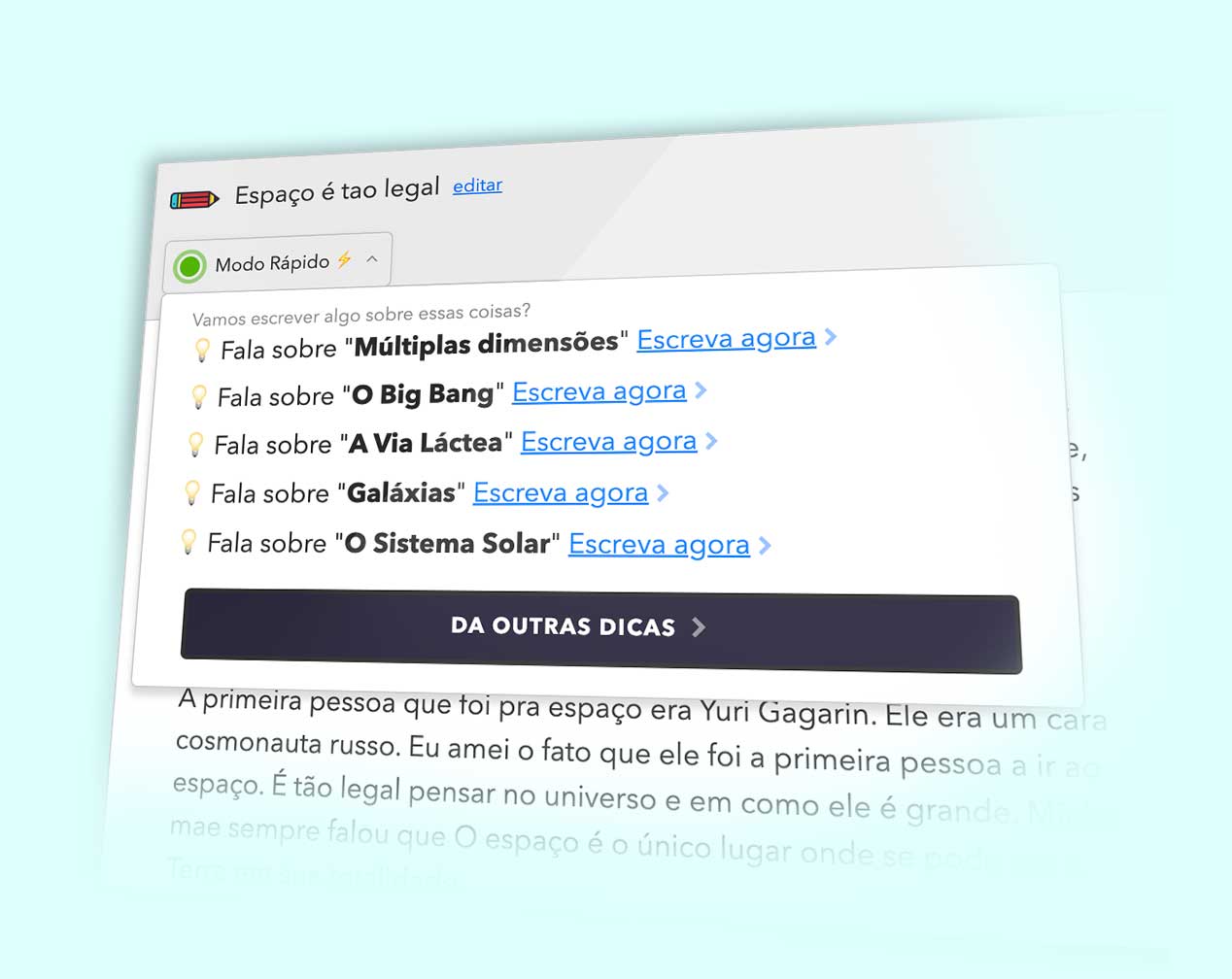 Você só tem que clicar 'Escreve Agora' e a gente vai escrever um parágrafo na hora. ✨ Comece agora!